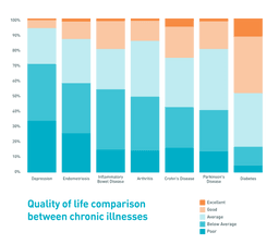 Quality of life with diagnosed endometriosis is reported to be as poor as those with other chronic illnesses. The above graph shows a comparison of quality of life between different chronic illnesses. Endometriosis has the second lowest quality of life after depression at 71%.